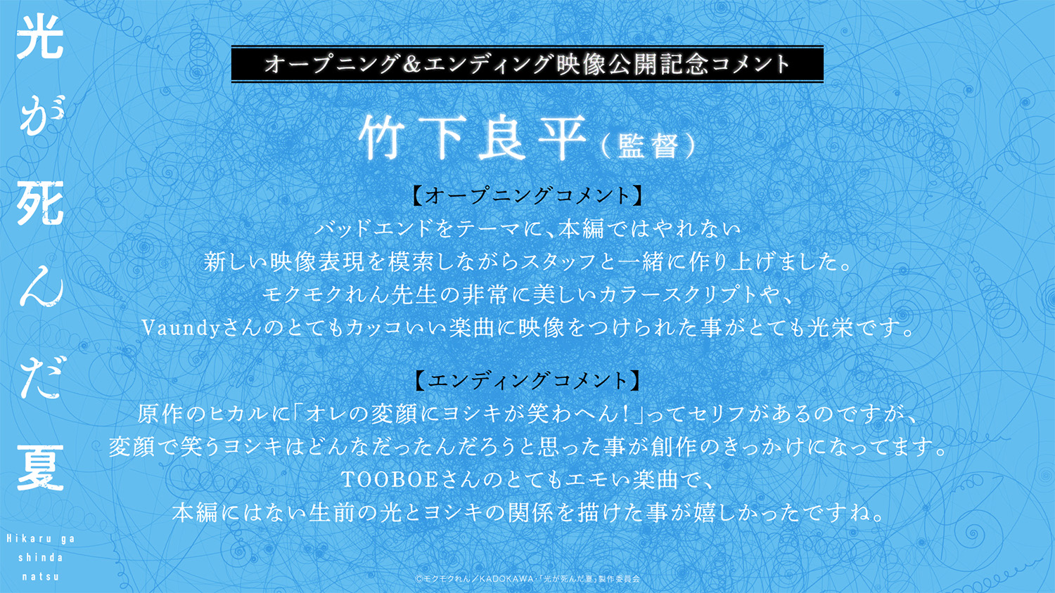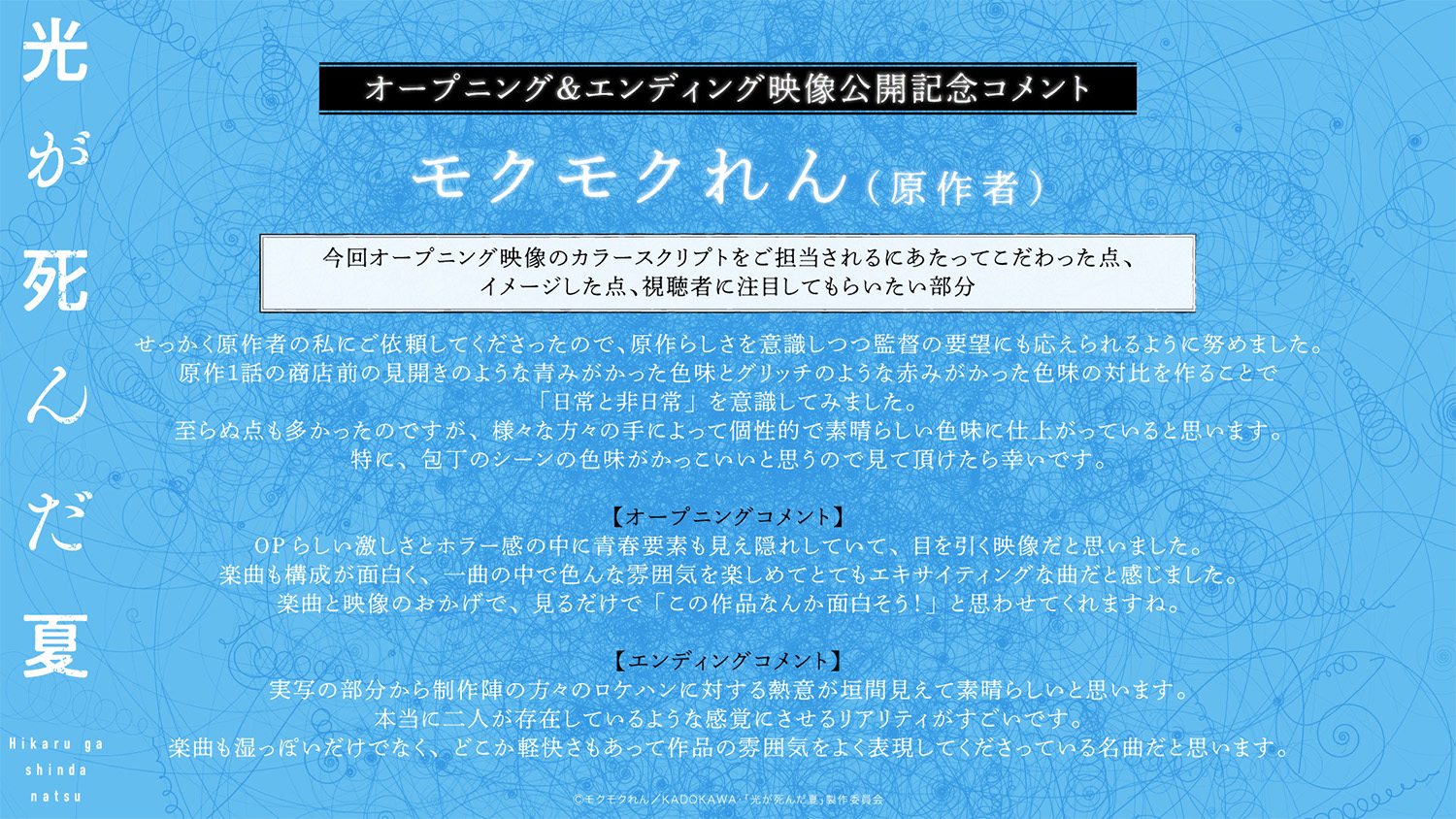 公開を記念して今回オープニング映像のカラースクリプトを担当したモクモクれん先生、竹下良平監督にスペシャルコメントをいただきました。