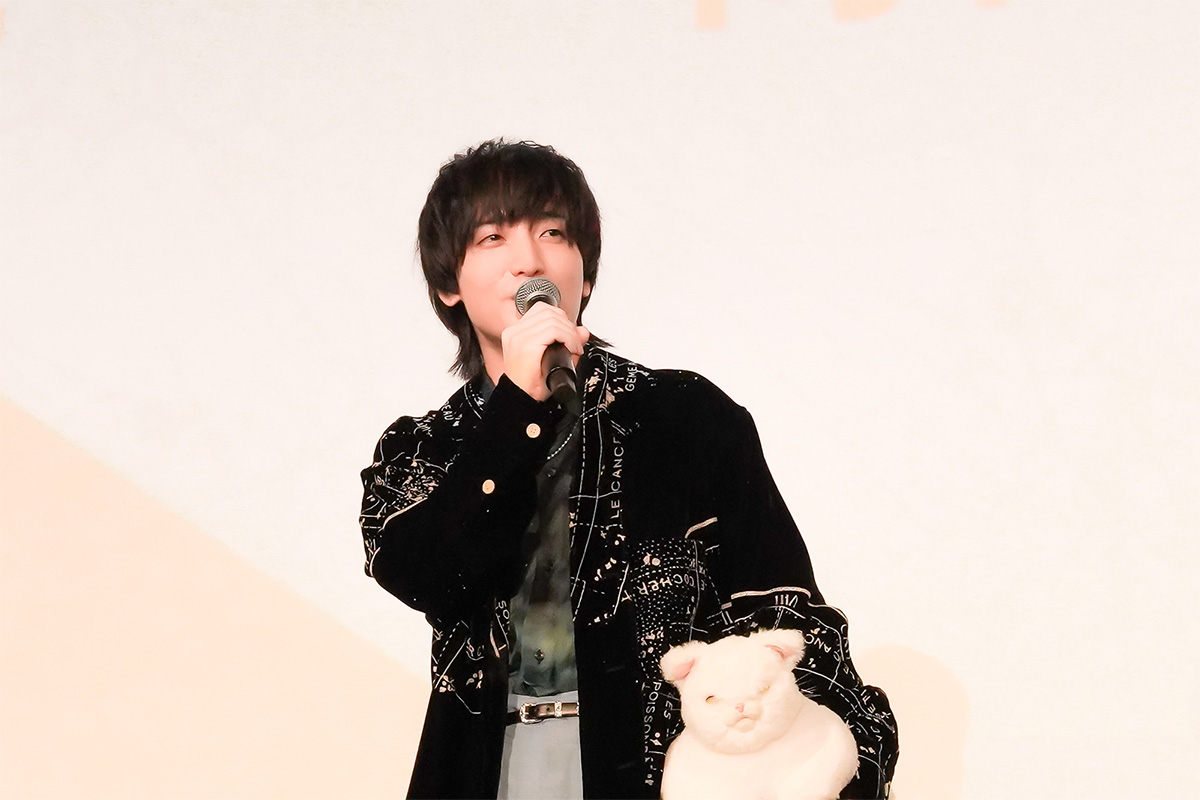 大きな拍手のなか小林千晃さん、梅田修一朗さん、小林親弘さん、竹下良平監督が登壇。小林(千)さんが作中にも登場する猫(メンチ兄貴)のぬいぐるみを片手に「ニャ〜」と挨拶。それに続けて、小林(親)さんも胸ポケットから、自身の演じる田中の相棒であるハムスターのぬいぐるみを取り出しアピールするという、まるで二段構えのコントのような流れに会場が笑いに包まれるという、和やかな雰囲気でイベントがスタート。